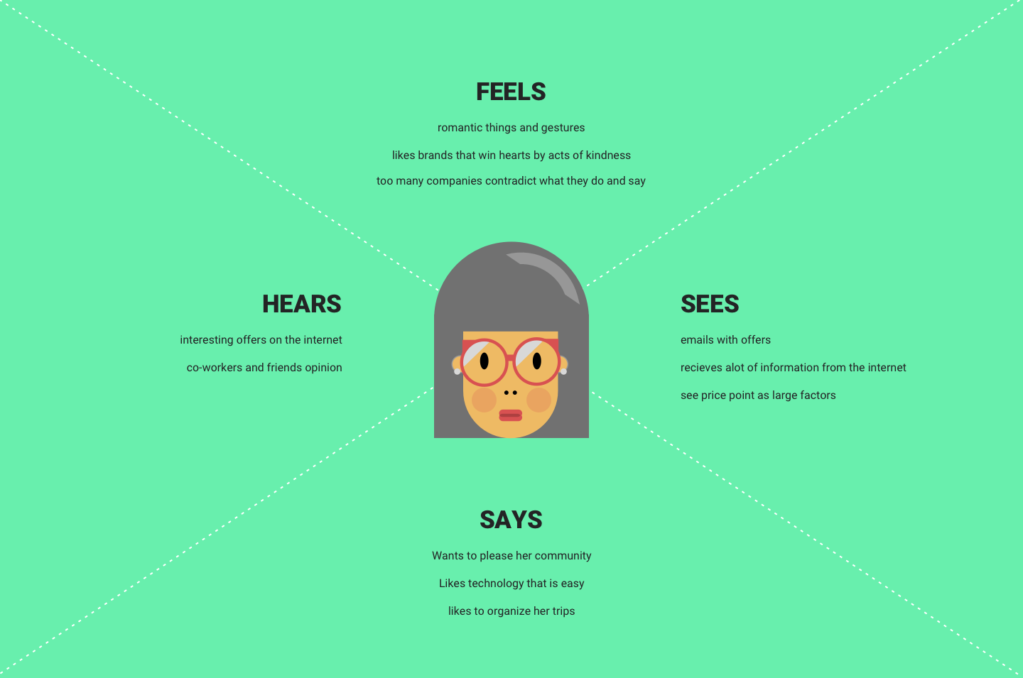 From the discovery, I found 48% of travelers do all of their travel operations on mobile devices. Based on the information given to me, I was able to create hypothetical personas. This allowed me to create an empathy map to understand what the user’s perspective is.